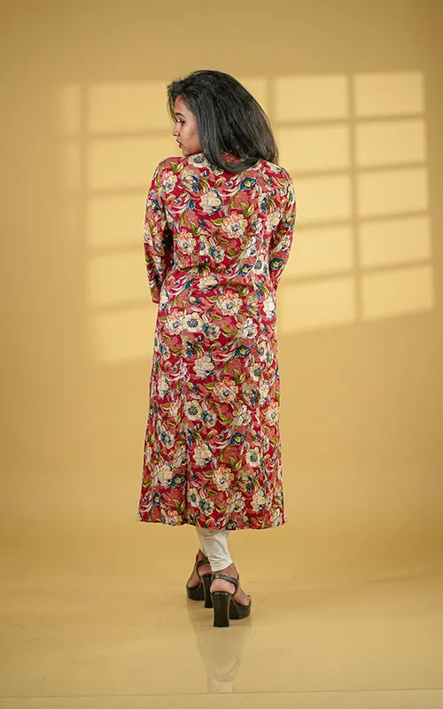 A-line princess cut rayon kurti with side pockets with floral design on a maroon base.