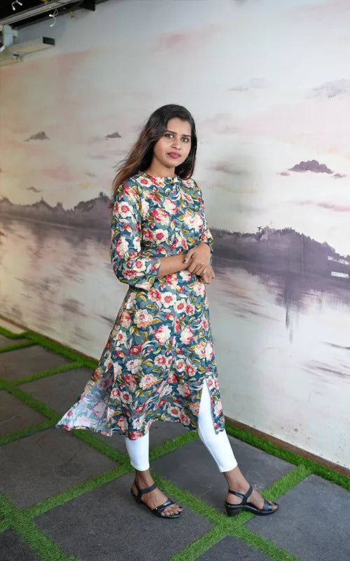 A-line princess cut rayon kurti with side pockets with floral design on a bluish green base.