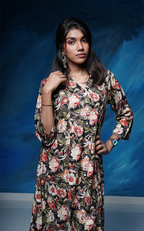 A-line princess cut rayon kurti with side pockets with floral design on a grey black base.