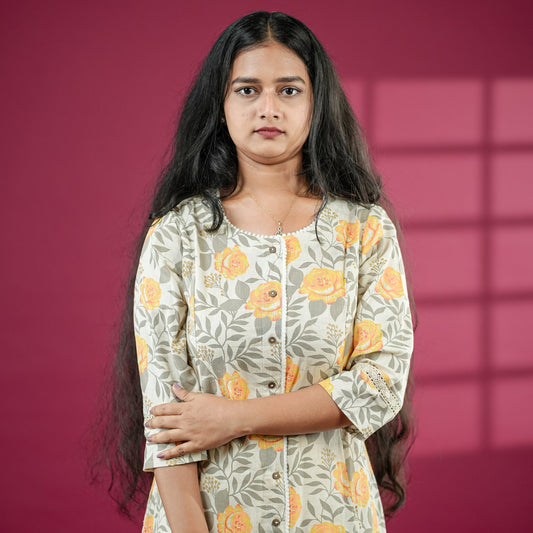 A-line Mustard coloured Cotton Kurti with stylish lace sleeves.