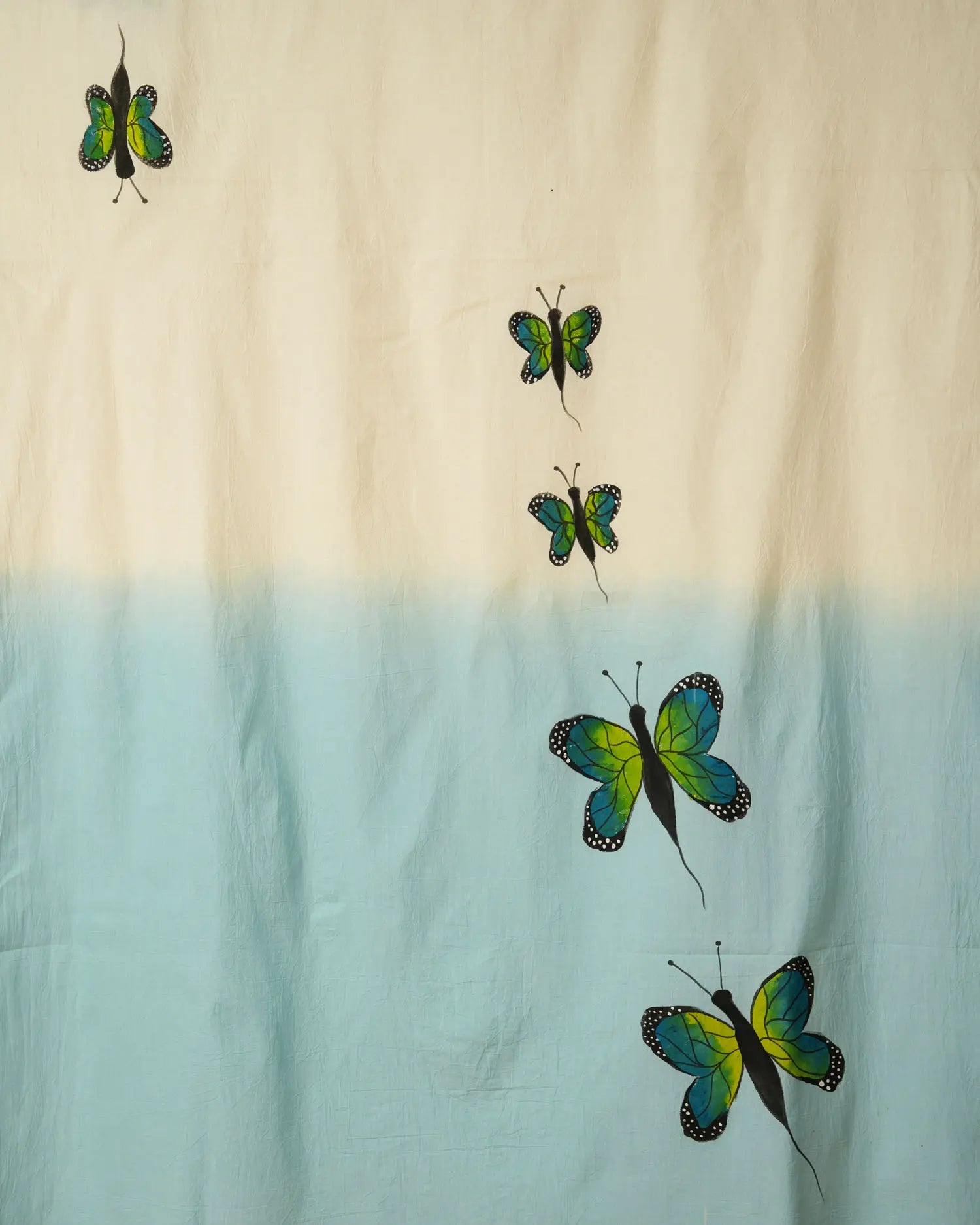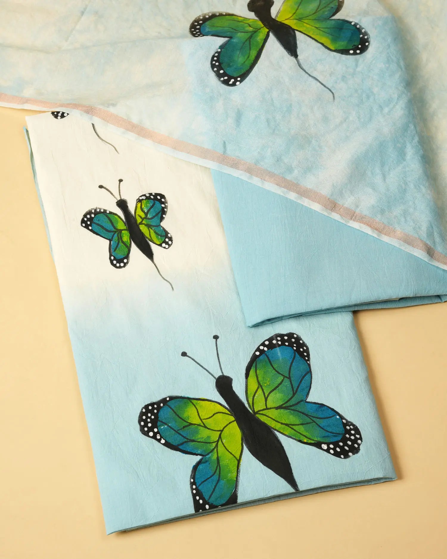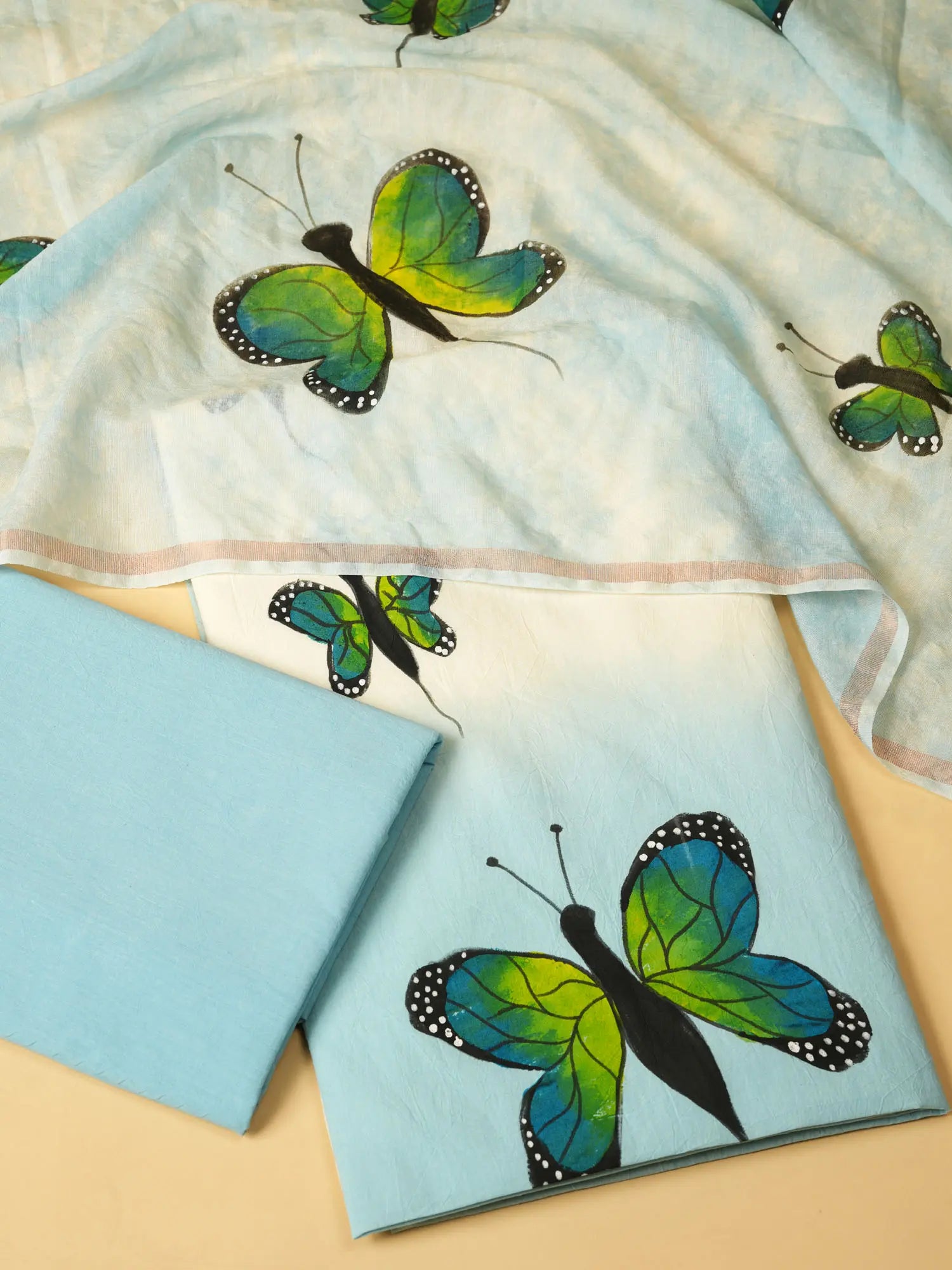 Introducing the “Aakarshan” unstitched salwar set by SANGOVI — a masterpiece of hand-painted artistry. The pure cotton top is adorned with vibrant butterfly motifs on a serene gradient of white and light blue, symbolizing grace and transformation. A plain sky-blue cotton bottom adds a subtle yet elegant balance, while the exquisite Chanderi–Kota dupatta, detailed with matching butterfly designs, completes the ensemble with timeless charm. Perfect for festive occasions and workplace elegance, this piece blends empowerment with tradition.