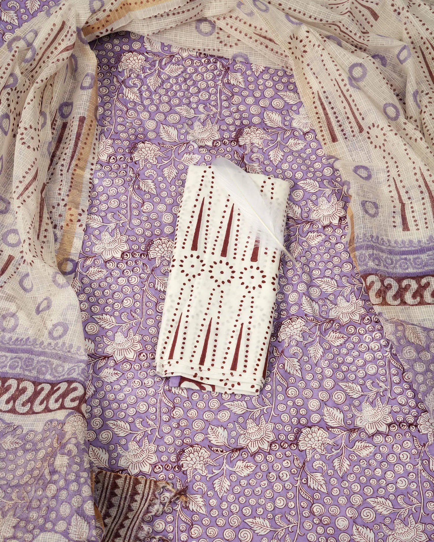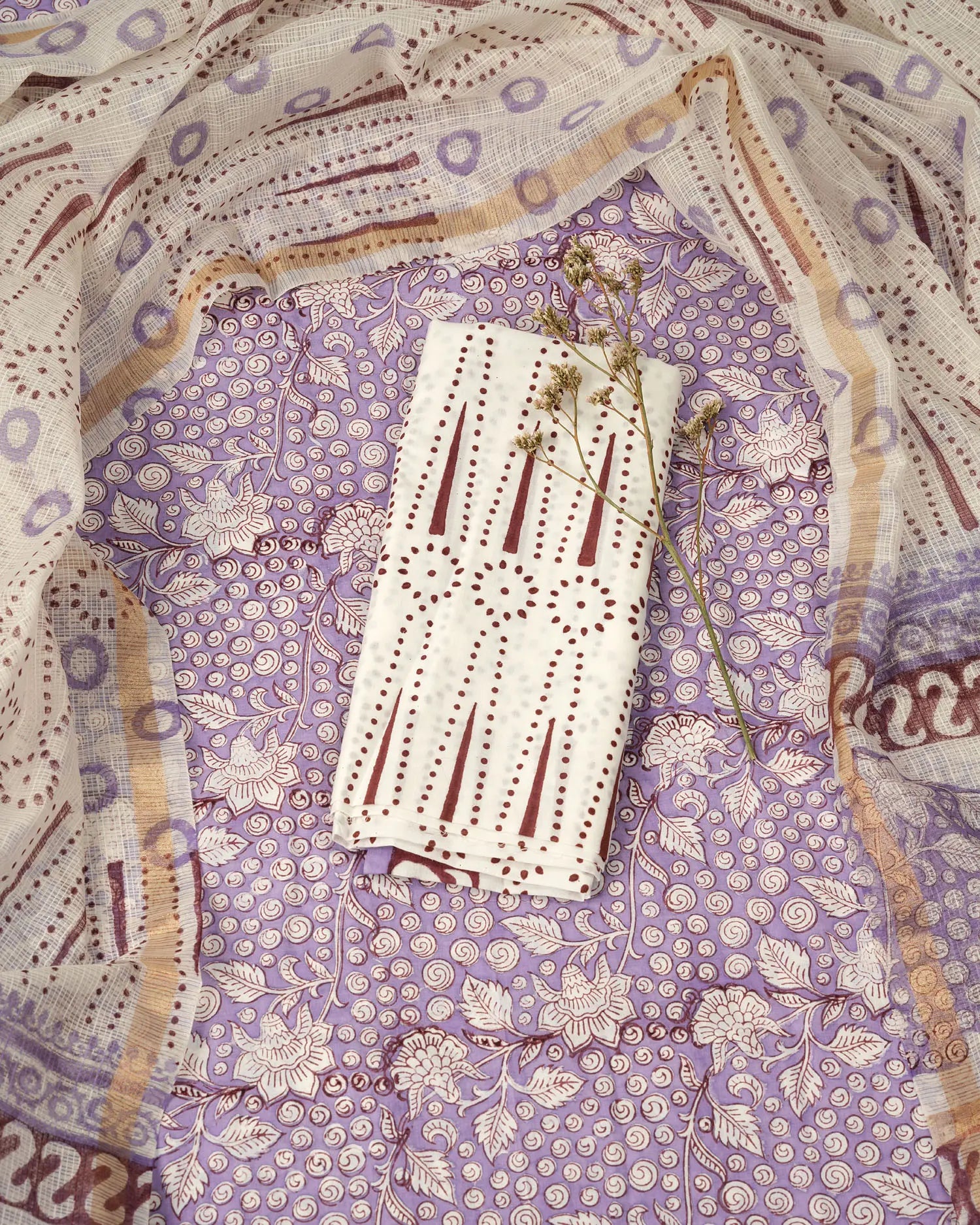 The "Draksa" salwar set includes a cotton top and bottom paired with a Kota dupatta. The violet floral and grapevine designs on the top and dupatta are complemented by an elegant off-white bottom. Perfect for enhancing your ethnic collection.