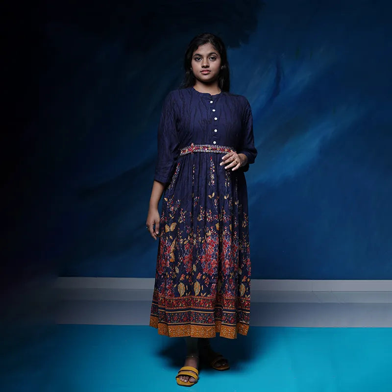 Flared navy blue dress style Kurti with embellished belt in rayon.