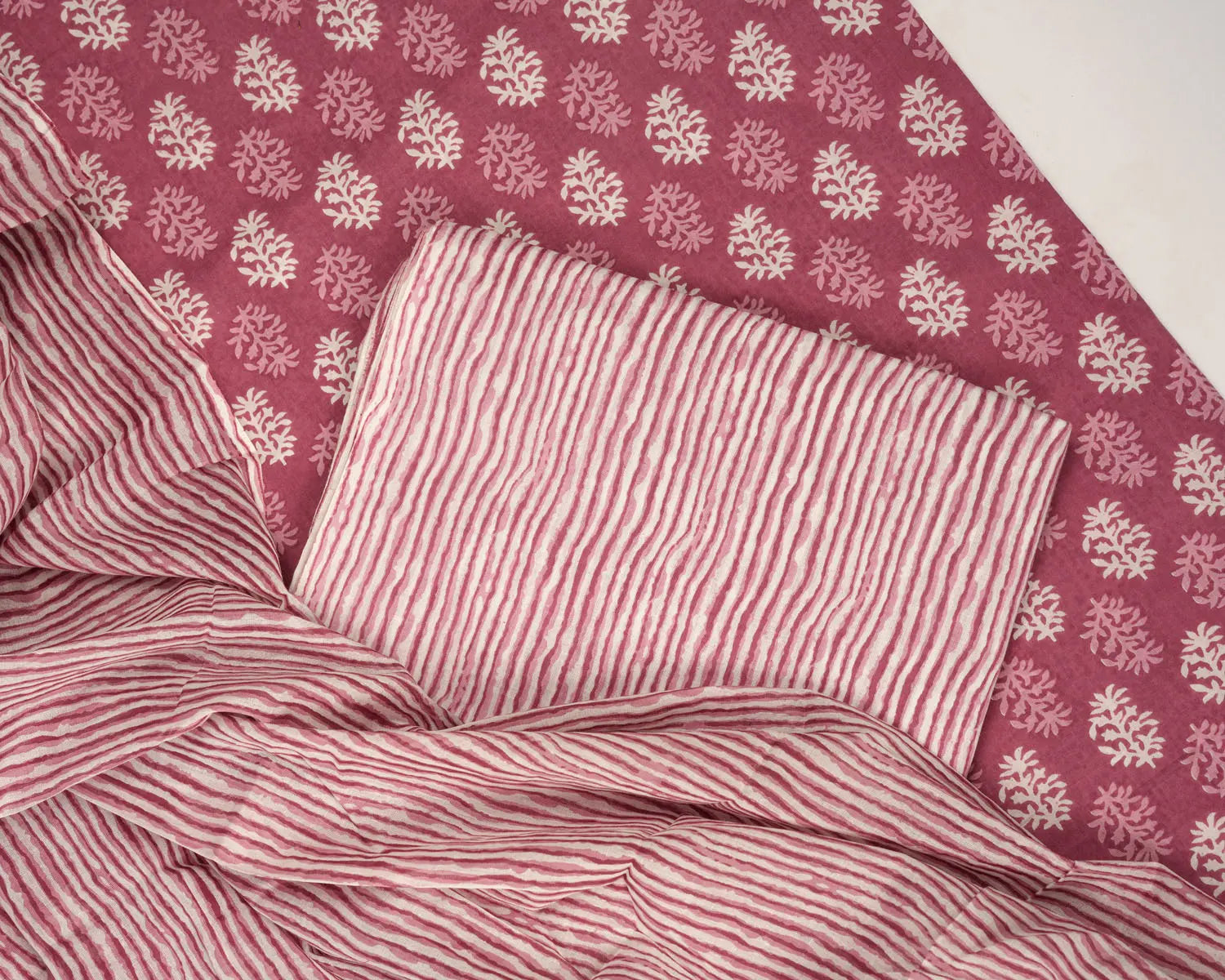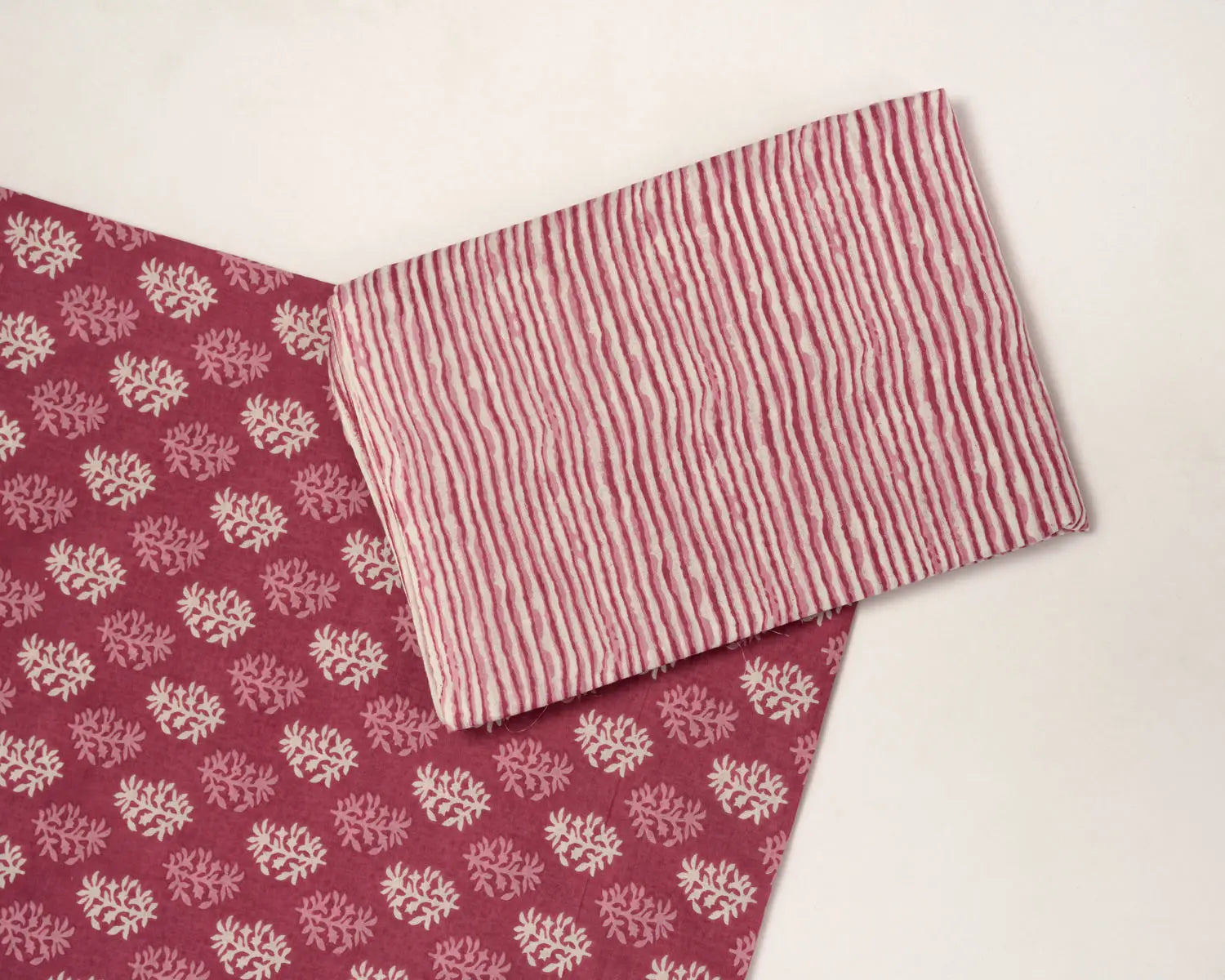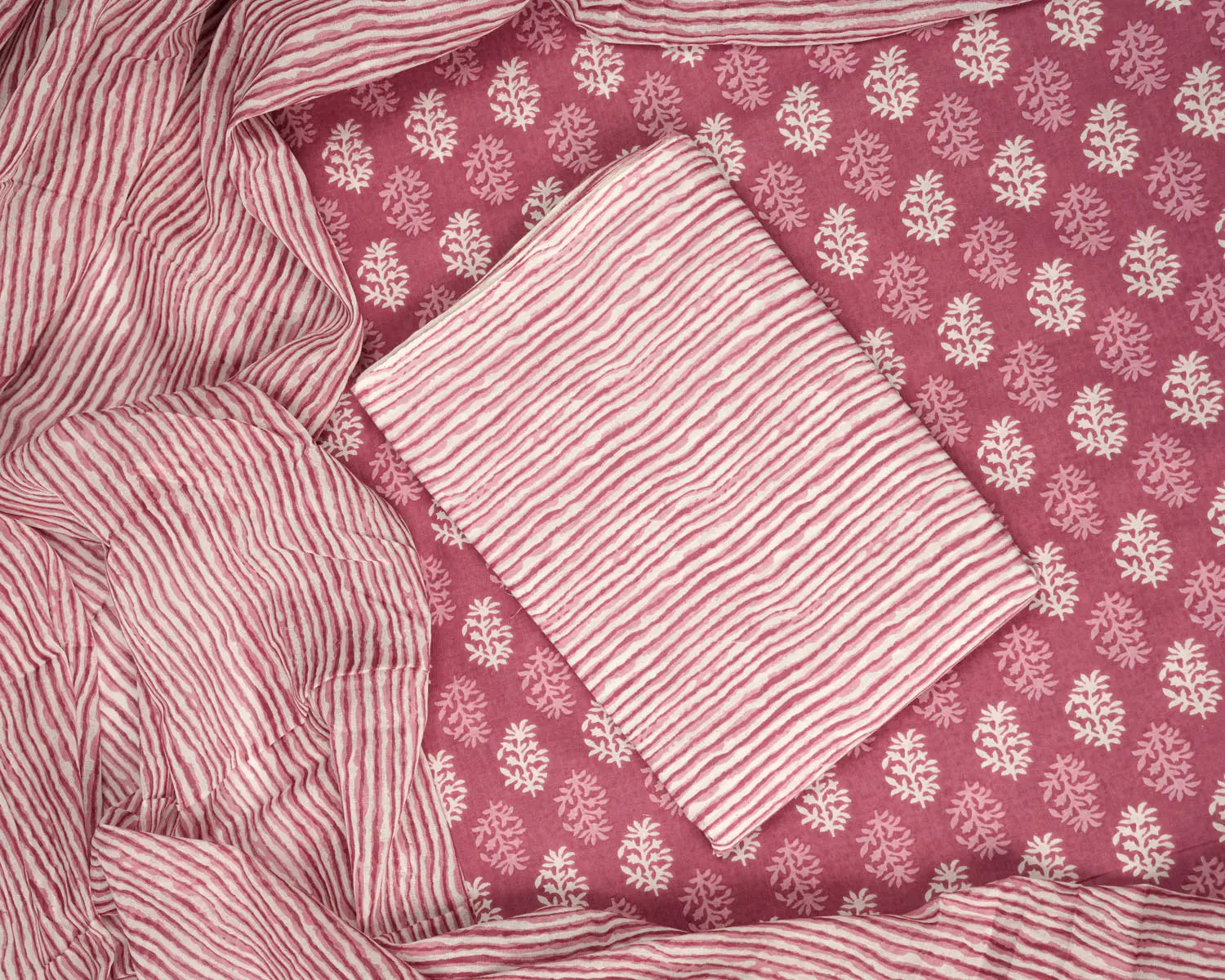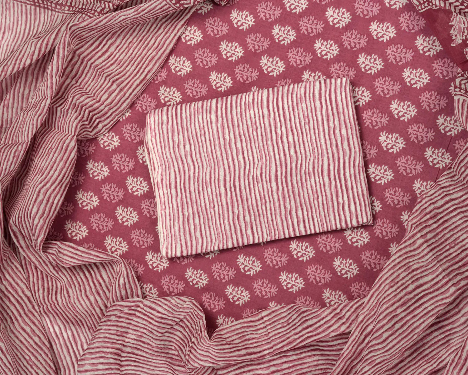 Presenting the “Kashvi” salwar set by SANGOVI. This unstitched collection features a cotton top and dupatta adorned with an elegant white and rose pattern on a lovely pink base, paired with a subtly striped pink bottom. Perfect for adding grace to your ethnic attire, it’s ideal for office wear or casual occasions.