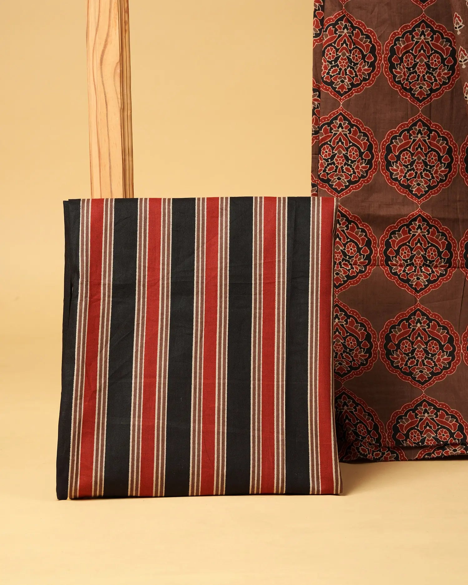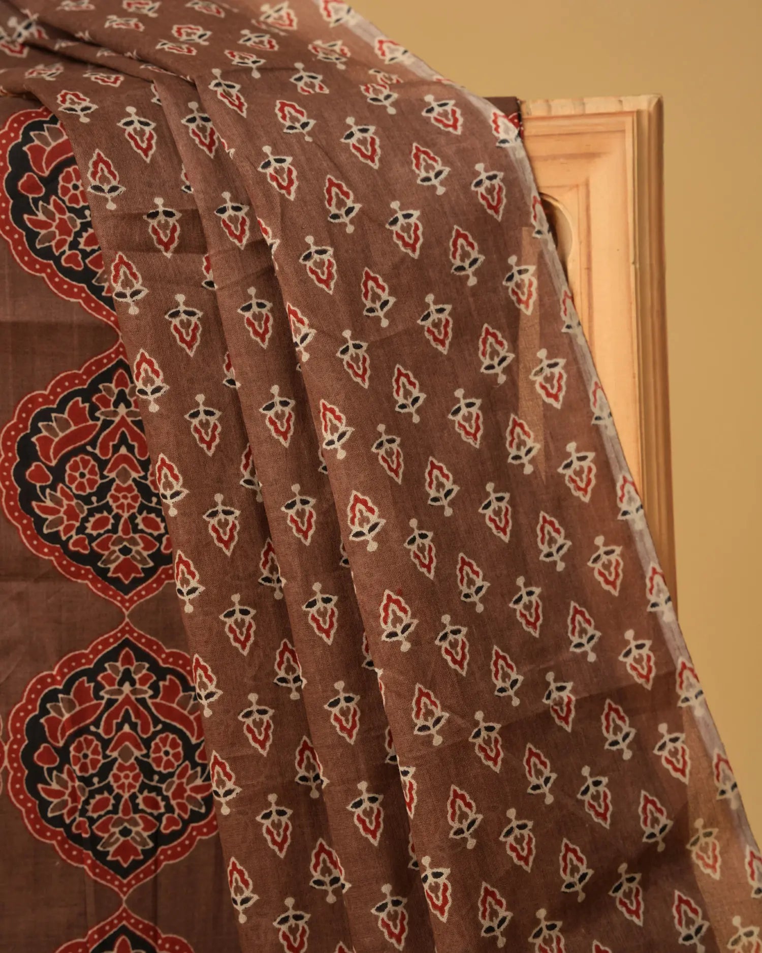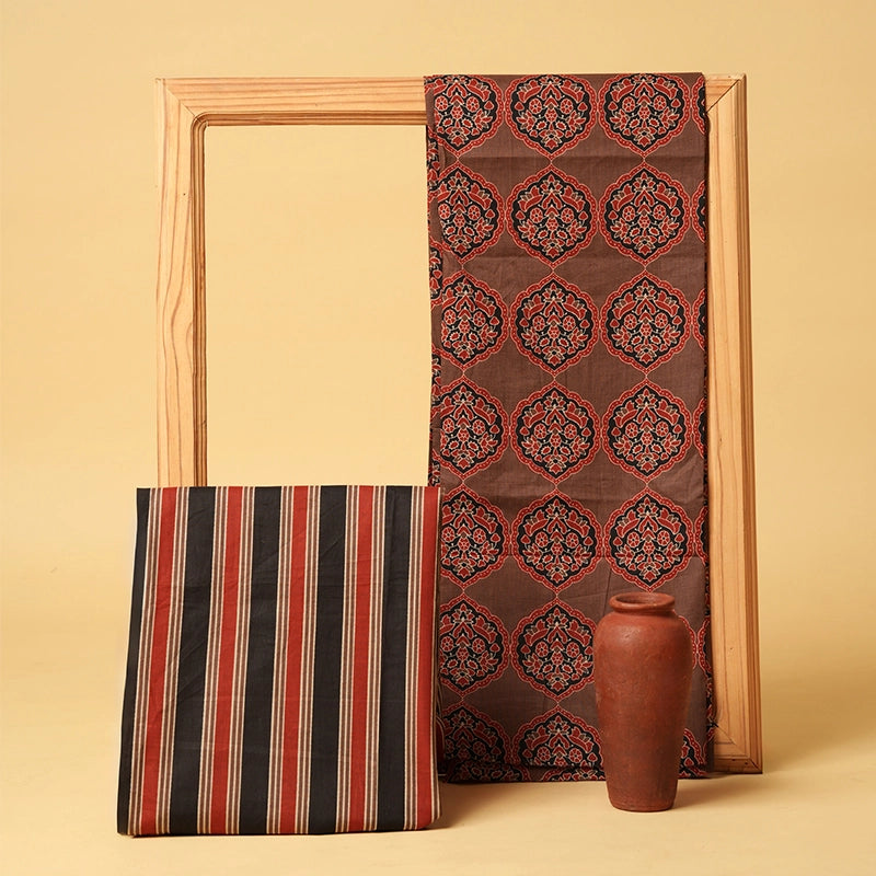 Mridula by SANGOVI — an unstitched pure cotton salwar set featuring elegant Ajrakh prints on a warm brown base, paired with a soft mul-cotton dupatta adorned with delicate tree motifs on a matching brown base. A graceful choice that blends tradition with modern charm, perfect for celebrations as well as professional settings.