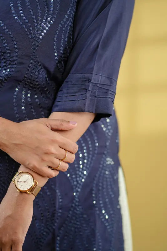 Navy blue sequin work muslin silk Kurti with bright orange digital print Dupatta.