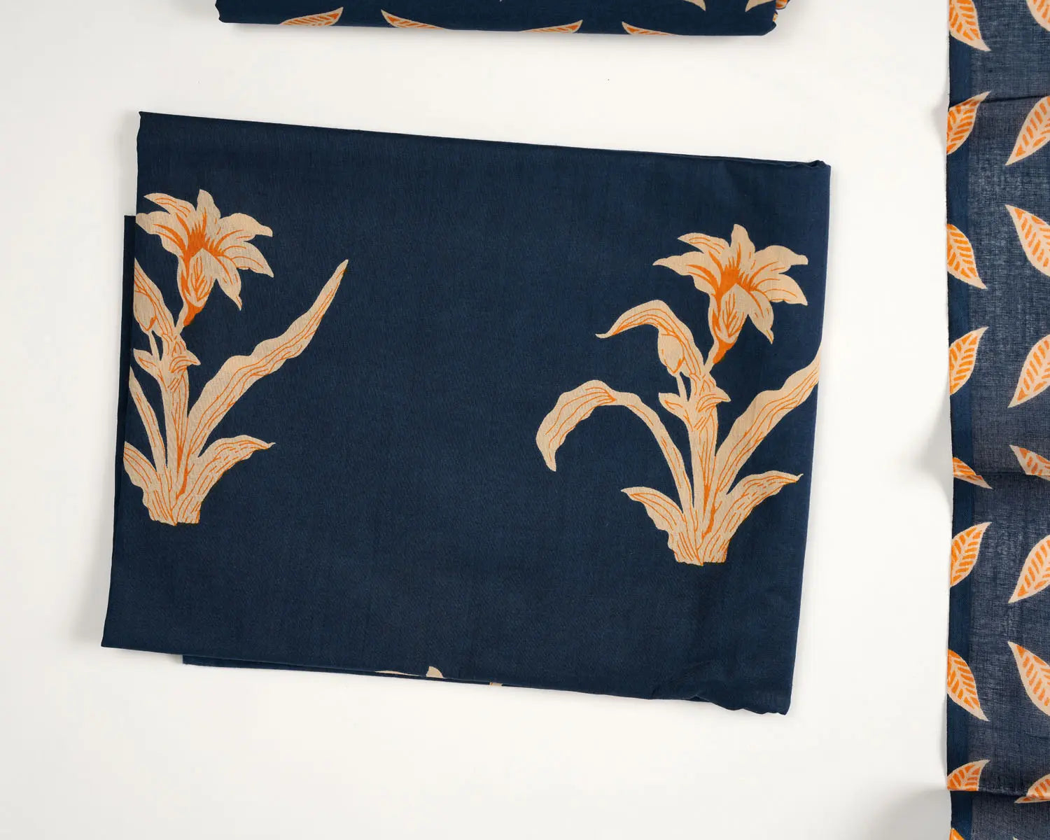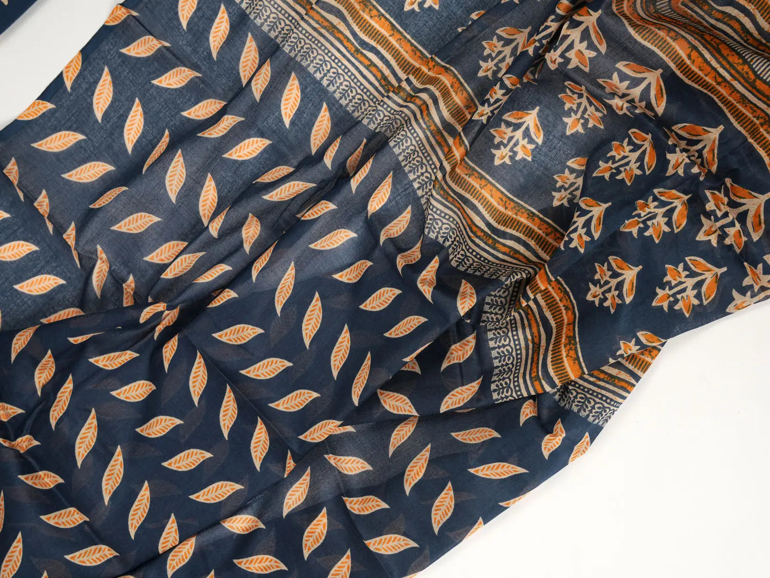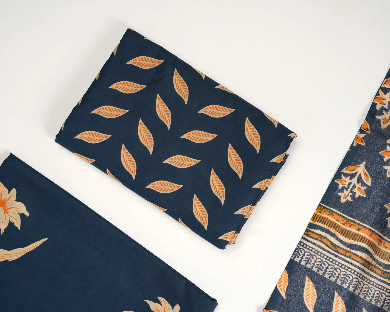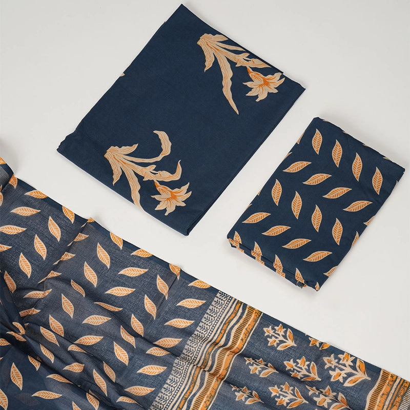 Discover timeless elegance with the “Nayika” unstitched salwar set by SANGOVI. Crafted in pure cotton, the top and dupatta feature a delightful shrub-and-flower pattern on a rich navy-blue base, exuding grace and sophistication. The coordinated bottom, adorned with a subtle leaf pattern in matching navy blue, completes the set with understated charm. A versatile choice, ideal for office wear, festive occasions, and daily elegance.