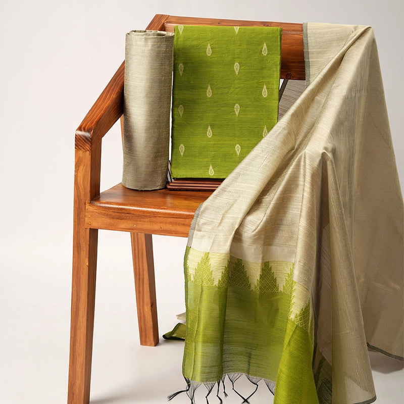 Introducing the “Nishitha” salwar from SANGOVI—a serene unstitched ensemble crafted from slub-buta silk. Featuring delicate white designs on a soothing light green base, this outfit exudes tranquillity and elegance. Versatile for special occasions and perfectly suited for office wear. Embrace the beauty of tradition with SANGOVI.