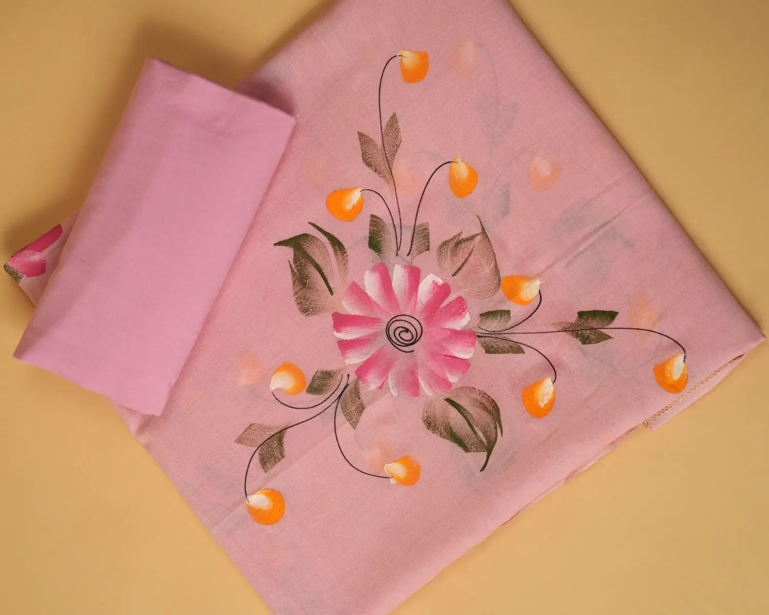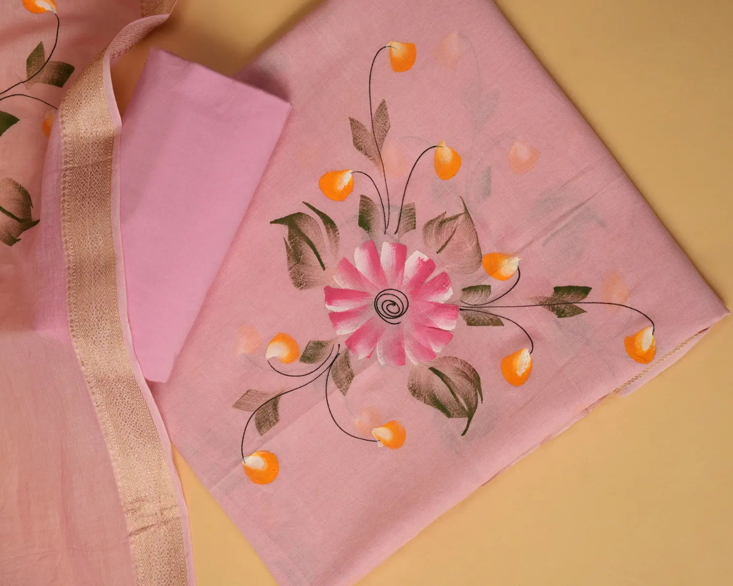 Introducing the “Pushpam” unstitched salwar set by SANGOVI — a graceful Mangalgiri (South Cotton) ensemble. The vibrant pink top and dupatta are beautifully adorned with dark pink floral motifs and elegant golden-black leaf accents, while the plain brilliant pink bottom adds a refined touch of simplicity. This set gracefully balances tradition and beauty, making it ideal for both office wear and special occasions.