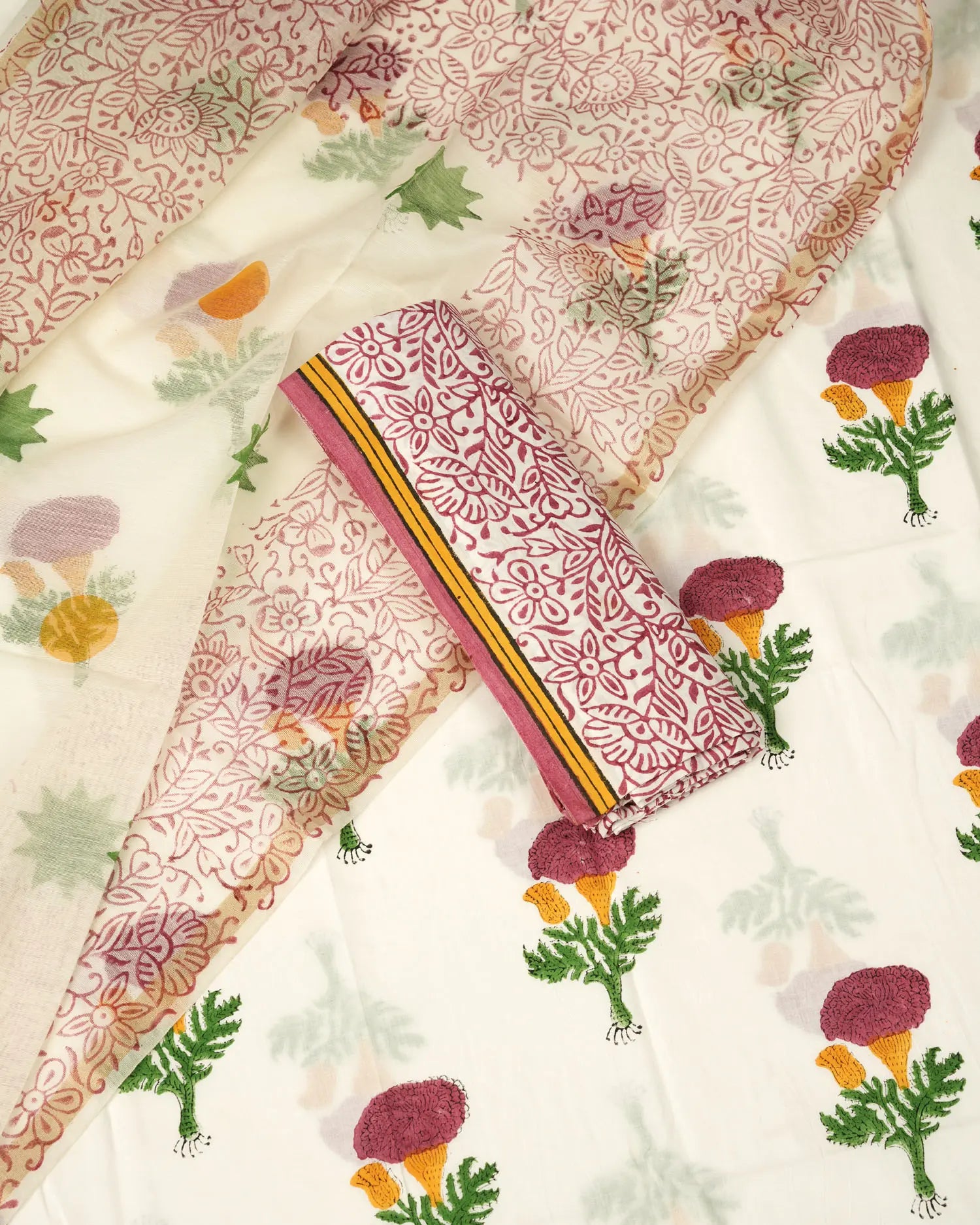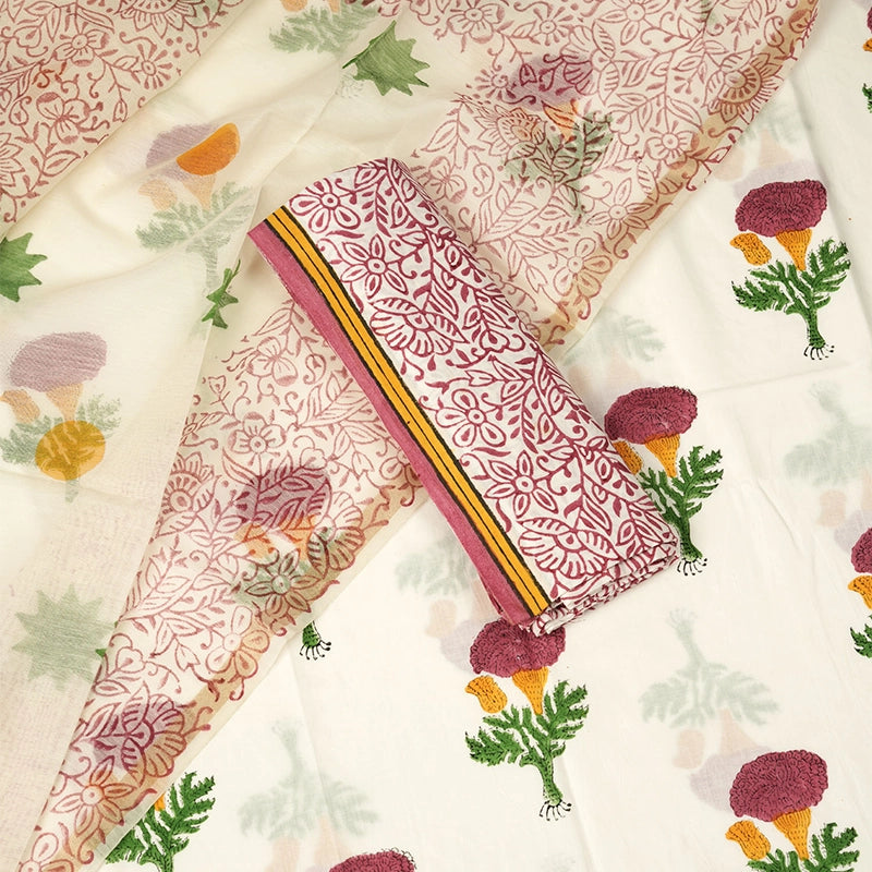 "Rangoli" from SANGOVI features a cotton top and bottom, beautifully adorned with vibrant red flowers on an off-white base, paired with a delicate Chanderi dupatta. The rose-colored vine pattern on the bottom adds elegance. Ideal for office and festive wear.