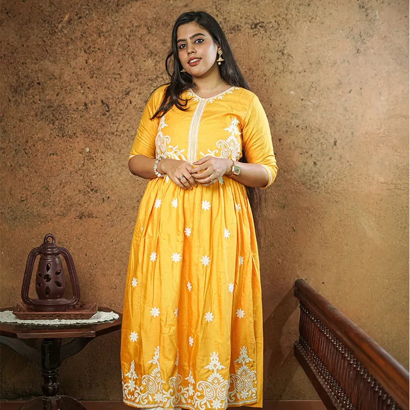Lovely bright yellow flared Naira side cut silk Kurti with embroidery work.
