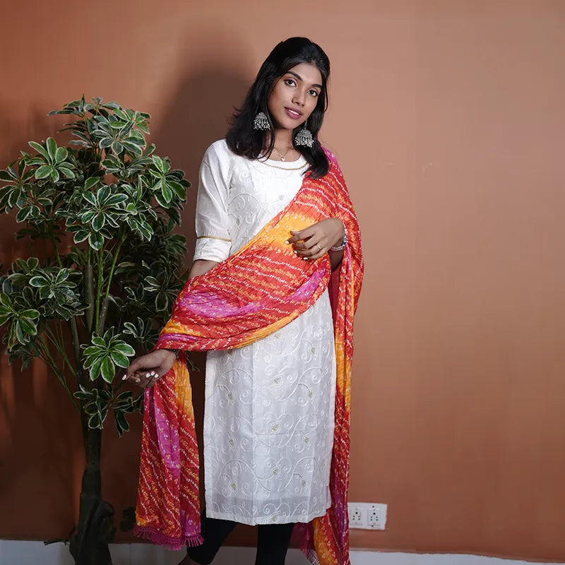 Rich white with embroidery and golden thread work Silk Kurti with bright red and yellow bandhej Dupatta.