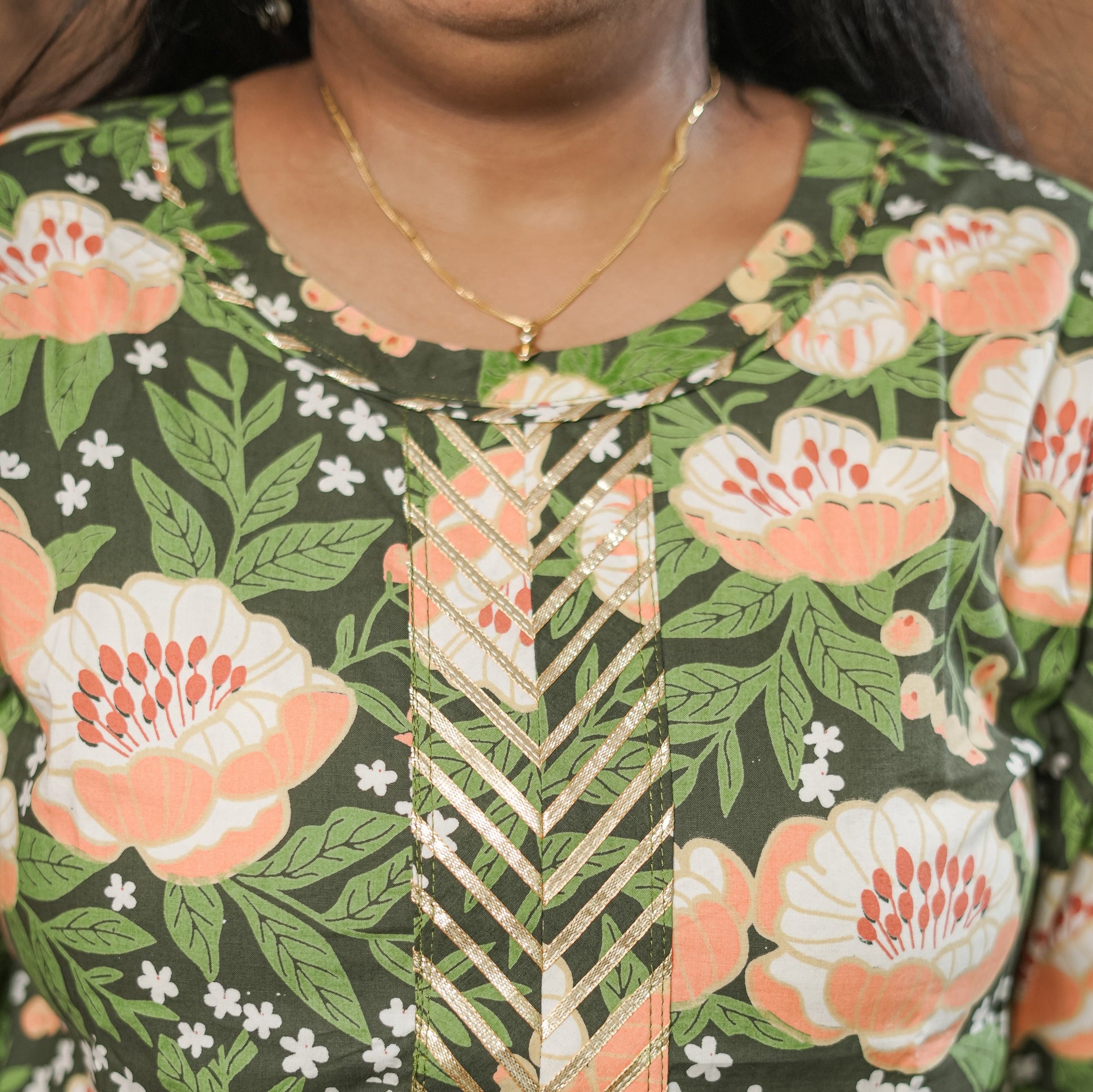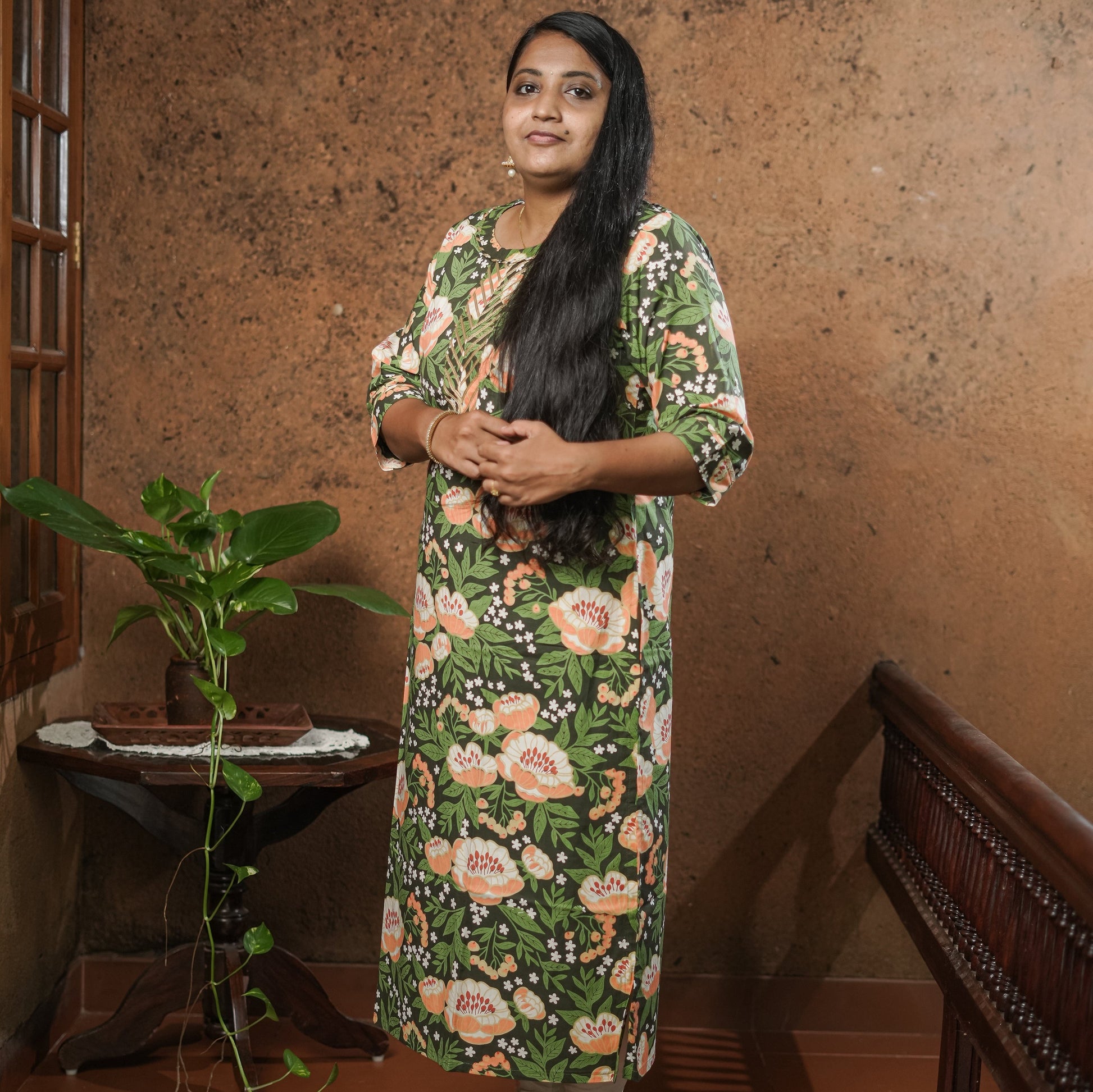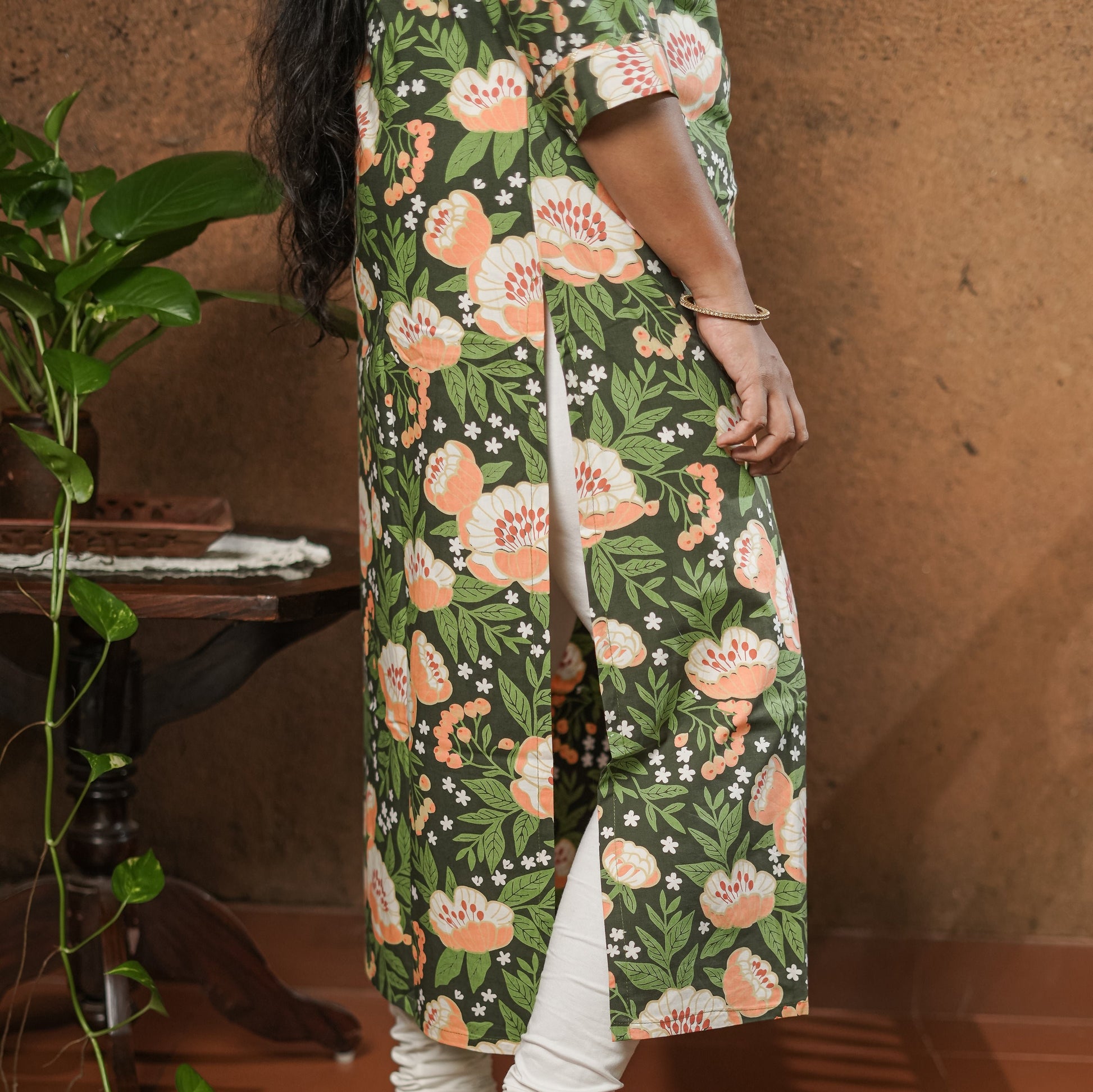 Straight cut simple pure cotton dark green Kurti with peach coloured floral print.