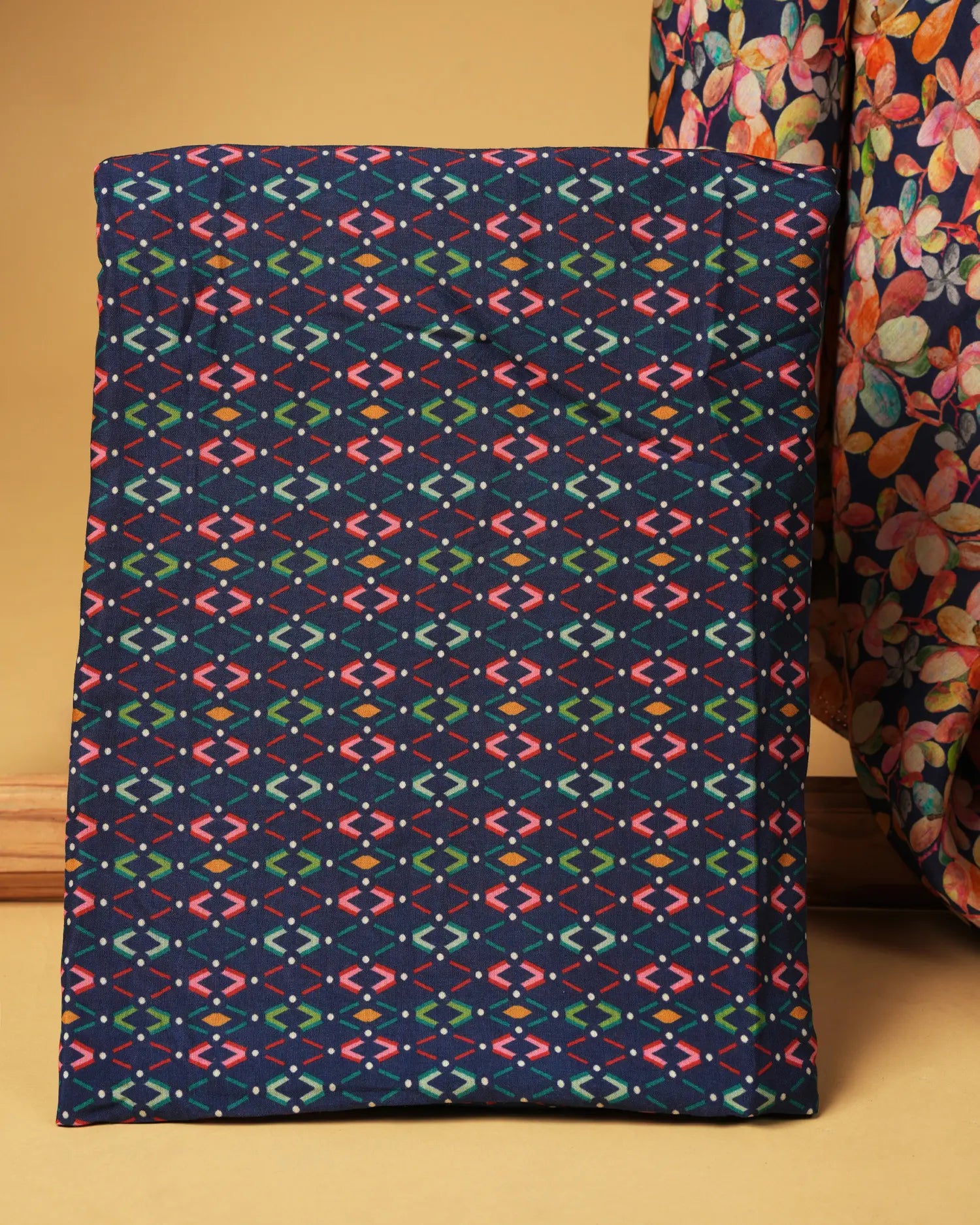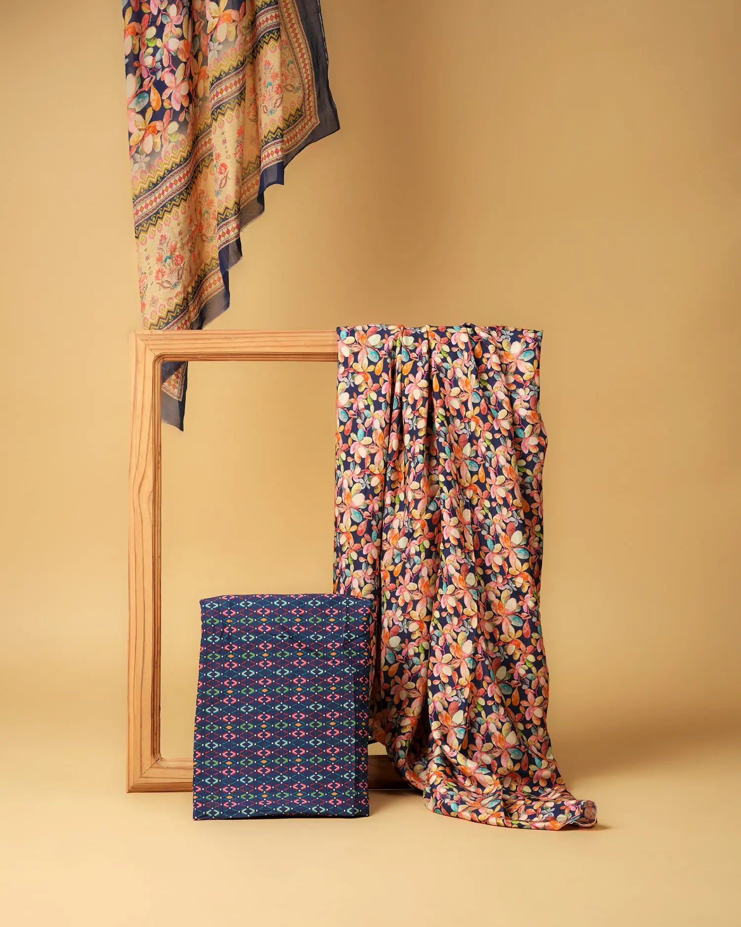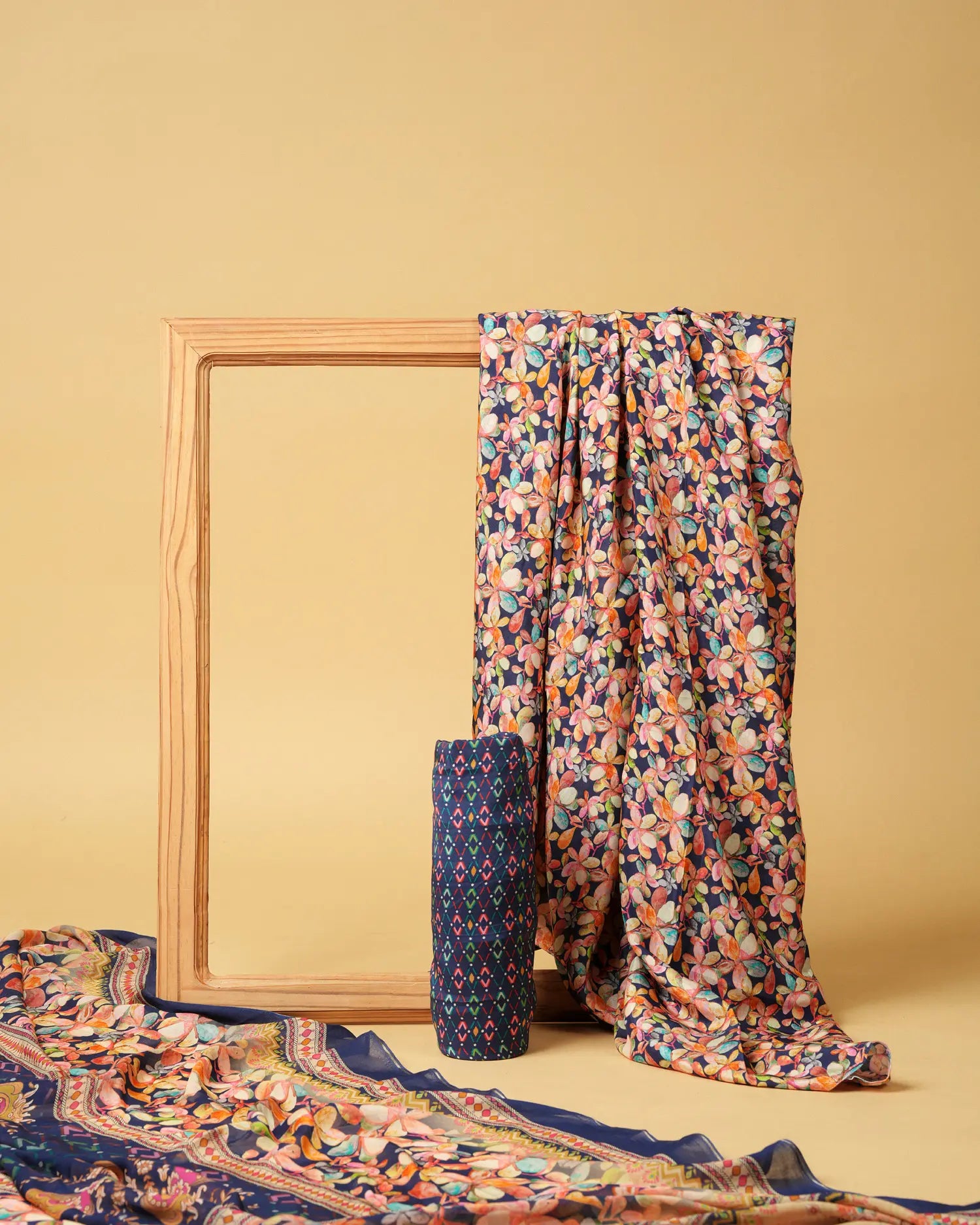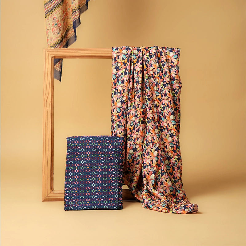 Discover the charm of the “Sukanya” unstitched salwar set by SANGOVI. This delightful ensemble features a muslin print top and dupatta adorned with vibrant multi-coloured floral motifs on a classic black base, complemented by a grand yet simple design on the muslin bottom. Perfect for office wear as well as special occasions, this piece reflects elegance and tradition in every detail. Embrace timeless style with SANGOVI’s “Sukanya.”