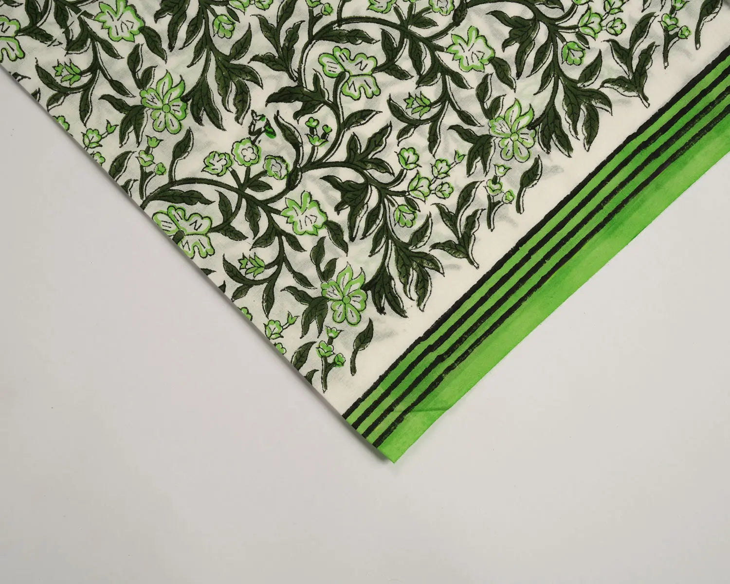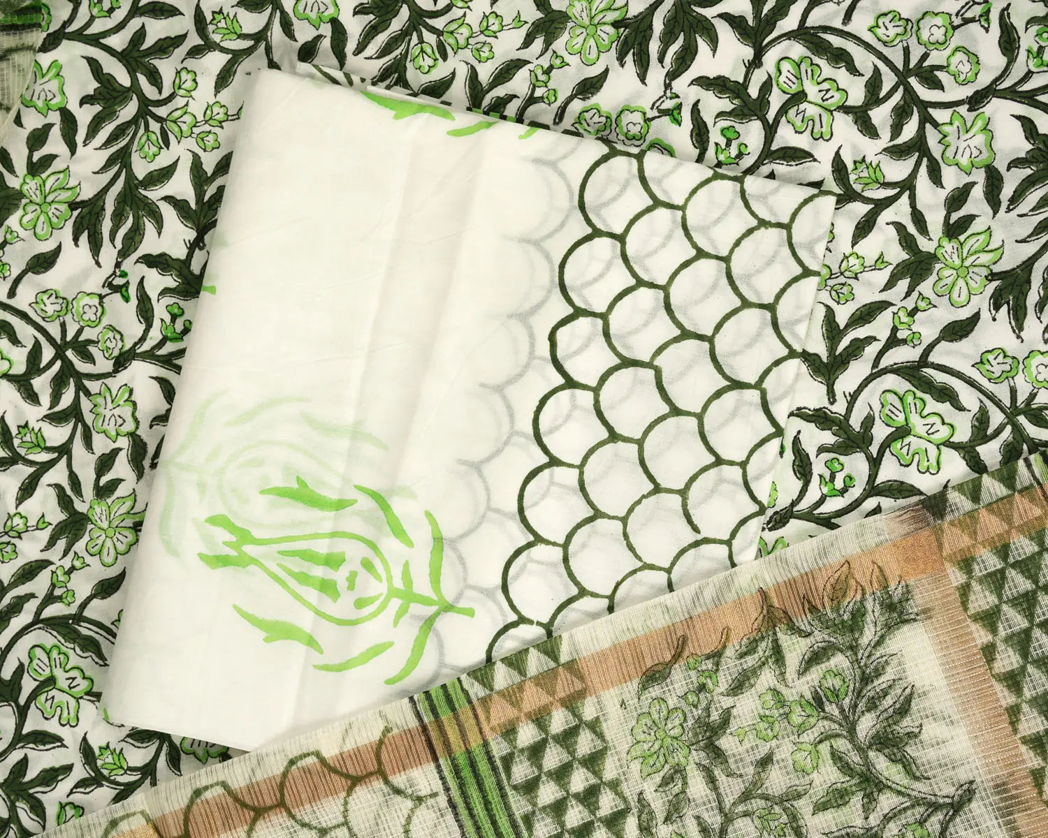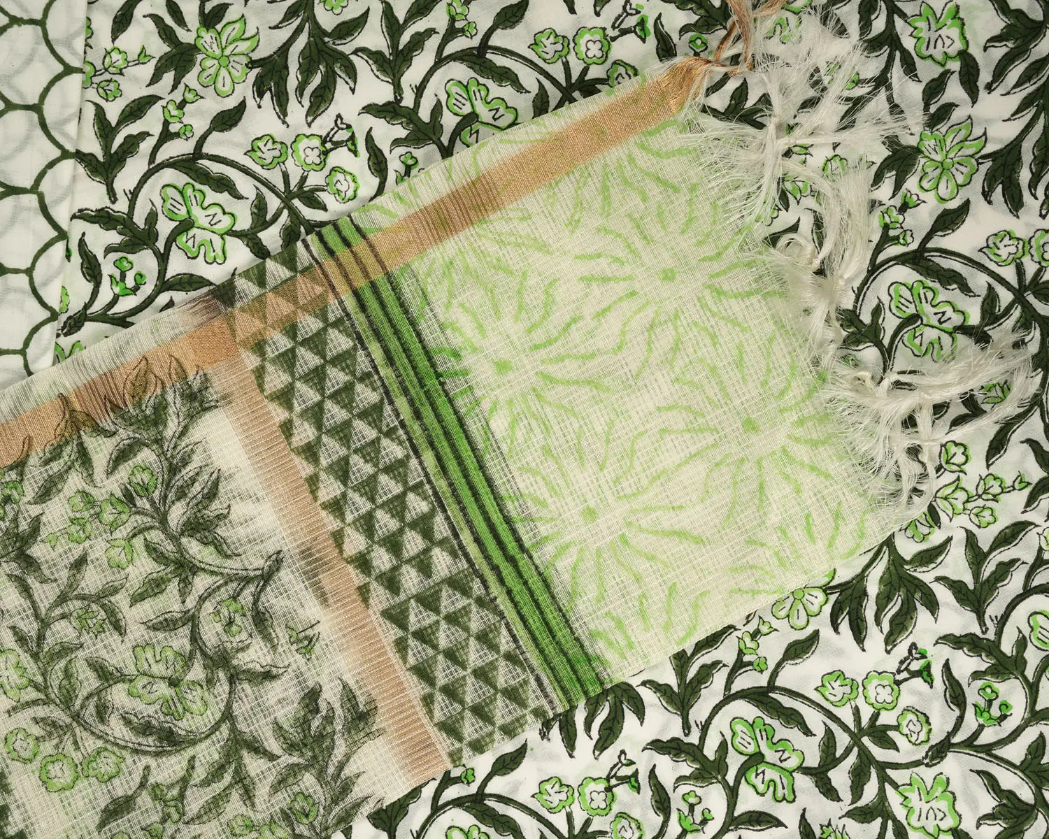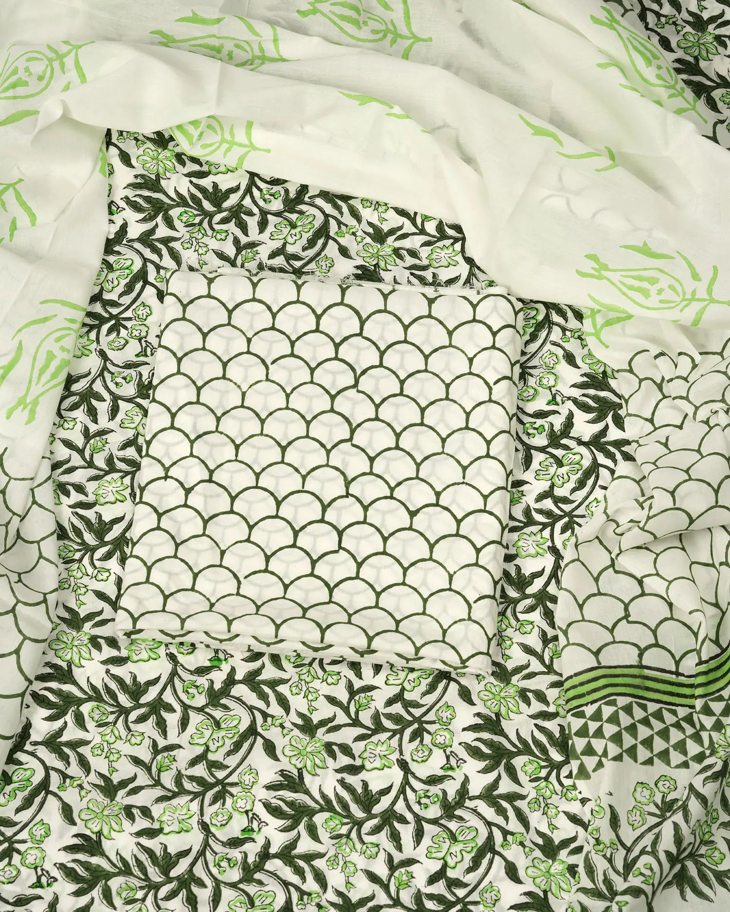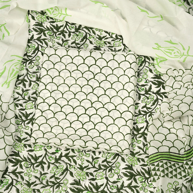 Description: Introducing "Aranya" from SANGOVI. This unstitched salwar set features a cotton top and bottom with a vibrant dark green vine and light green flower design on a white base, complemented by a simple semi-circle patterned bottom. Perfect for any occasion, especially as office wear. Embrace elegance and tradition with SANGOVI.