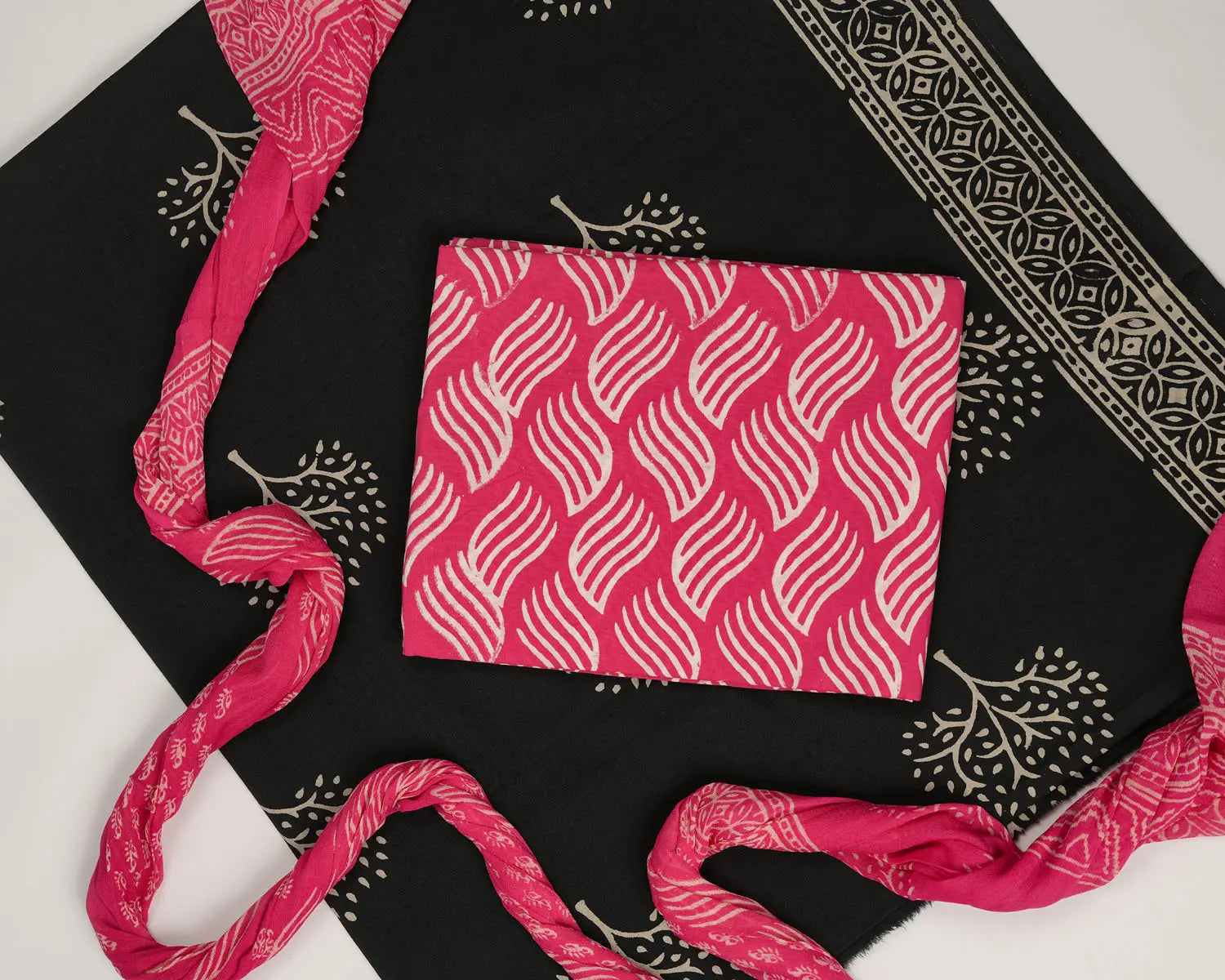 Experience the elegance of the “Vatsalya” unstitched salwar set by SANGOVI. This stunning ensemble features a pure cotton hand block printed top in black, adorned with delicate white tree motifs, paired with a peach-pink bottom showcasing a subtle pattern. The matching chiffon dupatta, also in peach pink, completes the look with graceful tree designs. Perfect for any occasion, especially as office wear, “Vatsalya” embodies traditional beauty and timeless grace.
